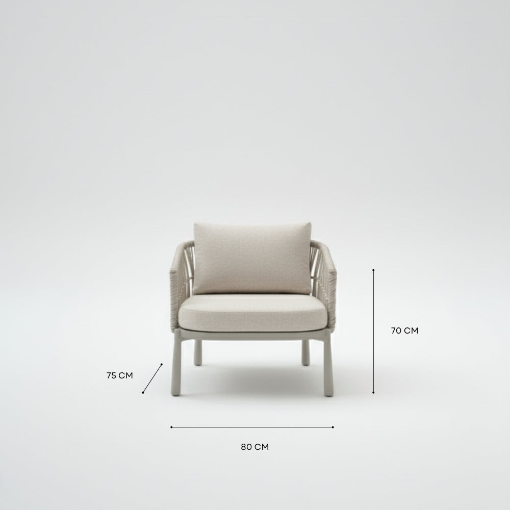 Crafted from a high-quality aluminum frame, each piece is rust-resistant, lightweight, and engineered to withstand outdoor elements year-round. The hand-woven rope detailing adds natural texture and refined craftsmanship, while the plush cushions offer deep, supportive comfort for hours of relaxation.